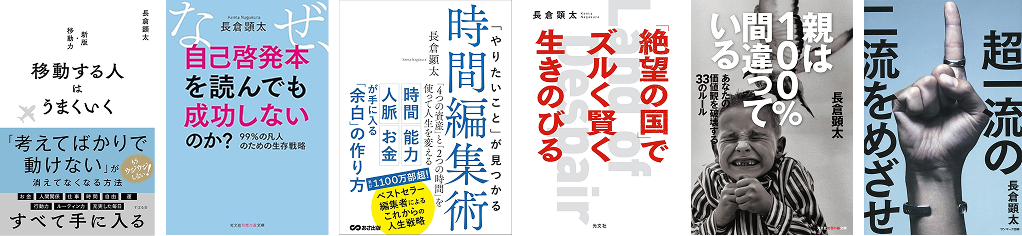 著書『移動する人はうまくいく。』『なぜ、自己啓発本を読んでも成功しないのか?』『親は100%間違っている』(光文社知恵の森文庫)、『「絶望の国」でズルく賢く生きのびる』(光文社)、『「やりたいこと」が見つかる時間編集術』(あさ出版)、『超一流の二流をめざせ! 』(サンマーク出版)、『常識の1ミリ先を考える。』(サンクチュアリ出版)、『移動力』『モテる読書術』『GIG WORK』(すばる舎)などがある。